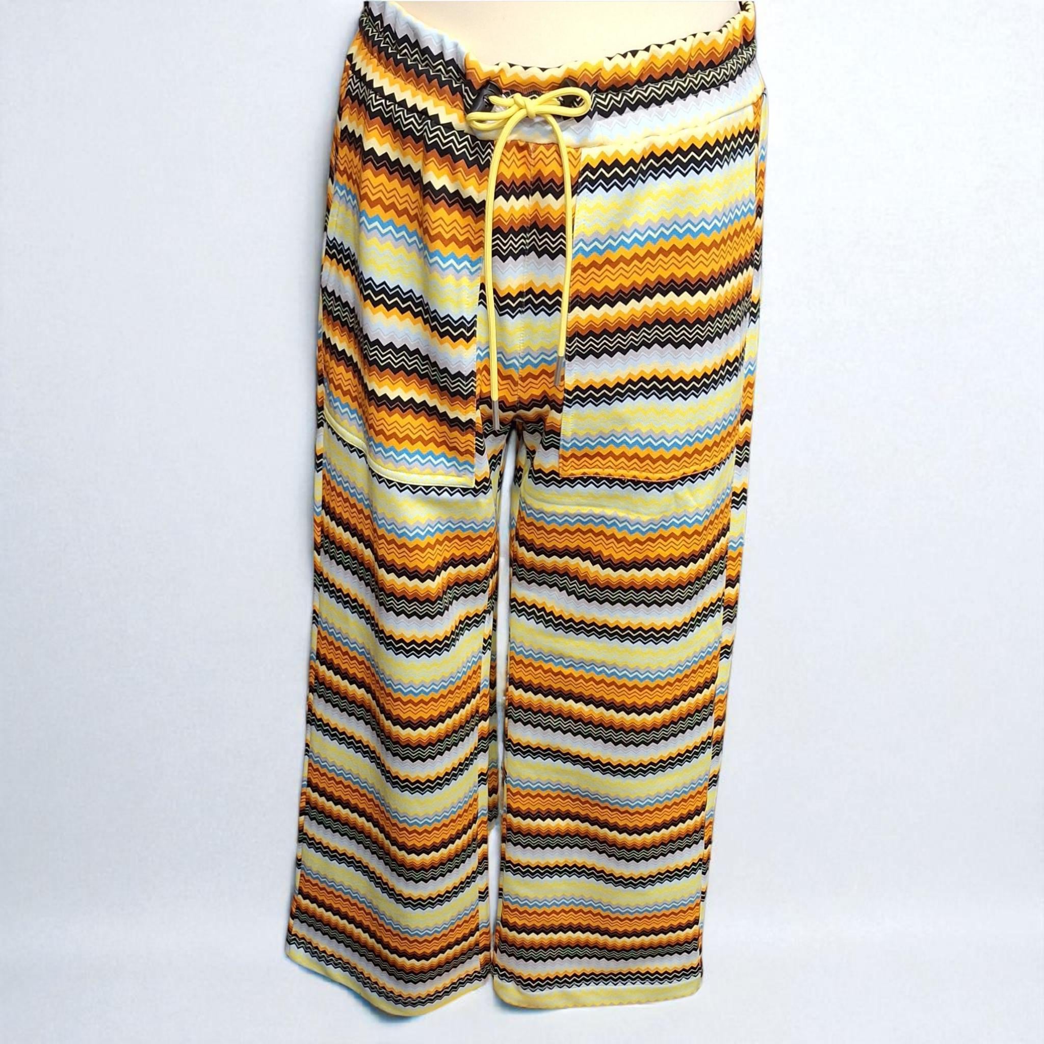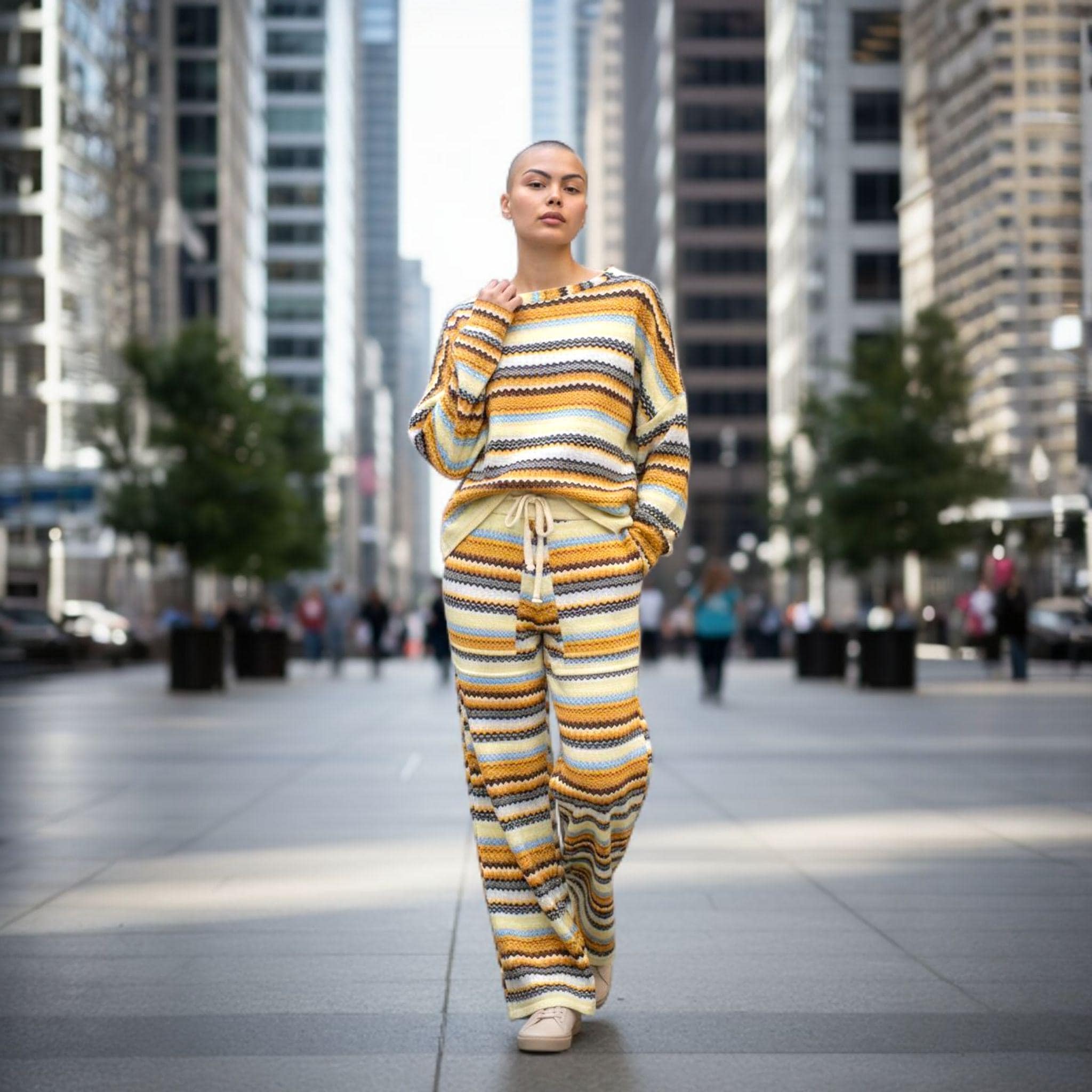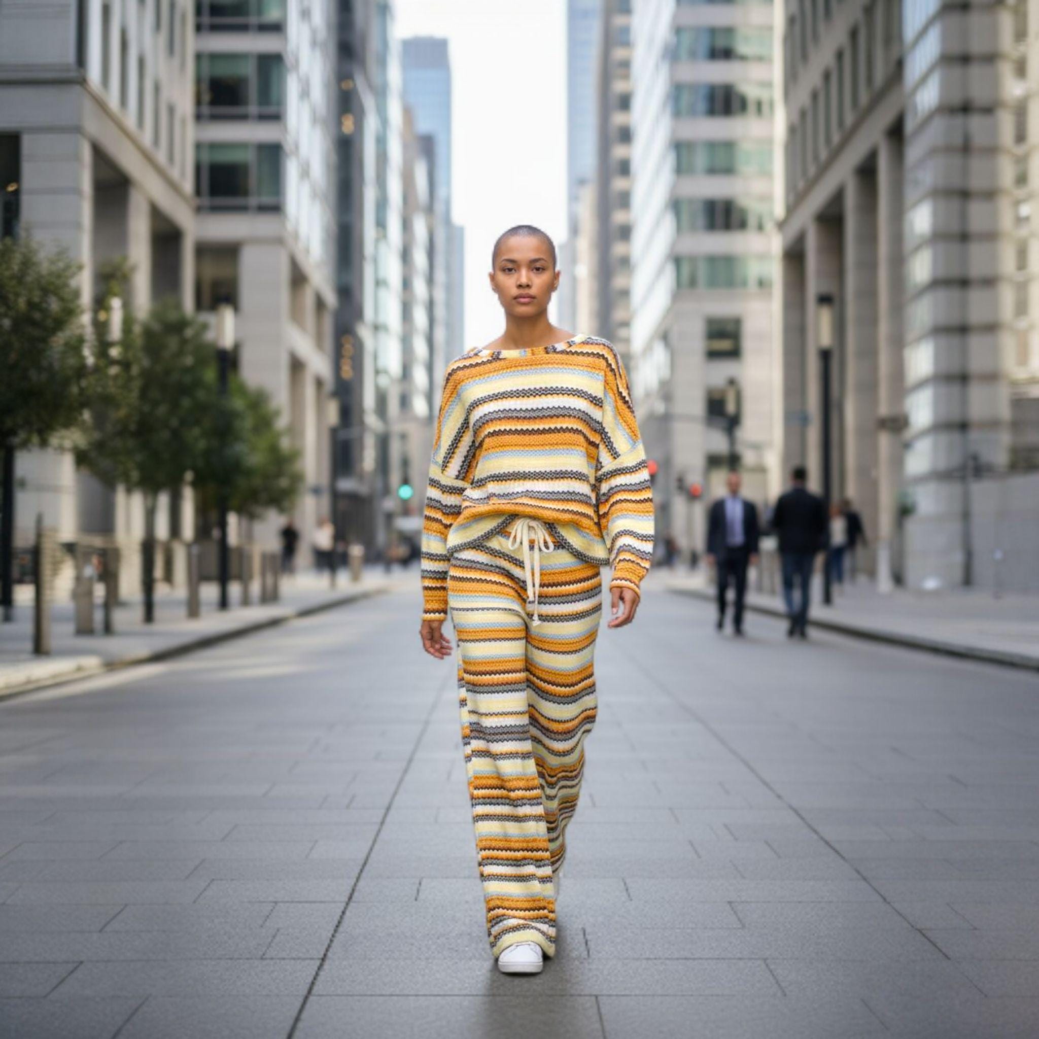 this two-piece outfit features a zigzag pattern in warm tones of yellow, brown, and white—a vibrant, modern combination that brightens any day.