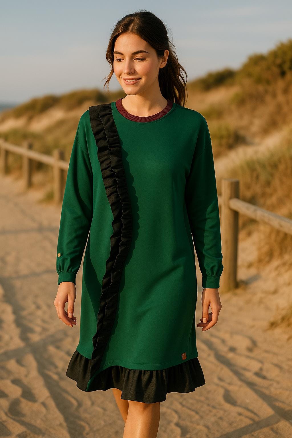 The highlight is the contrasting anthracite ruffle, applied asymmetrically from the shoulder to the hem, creating a subtle and elegant movement.