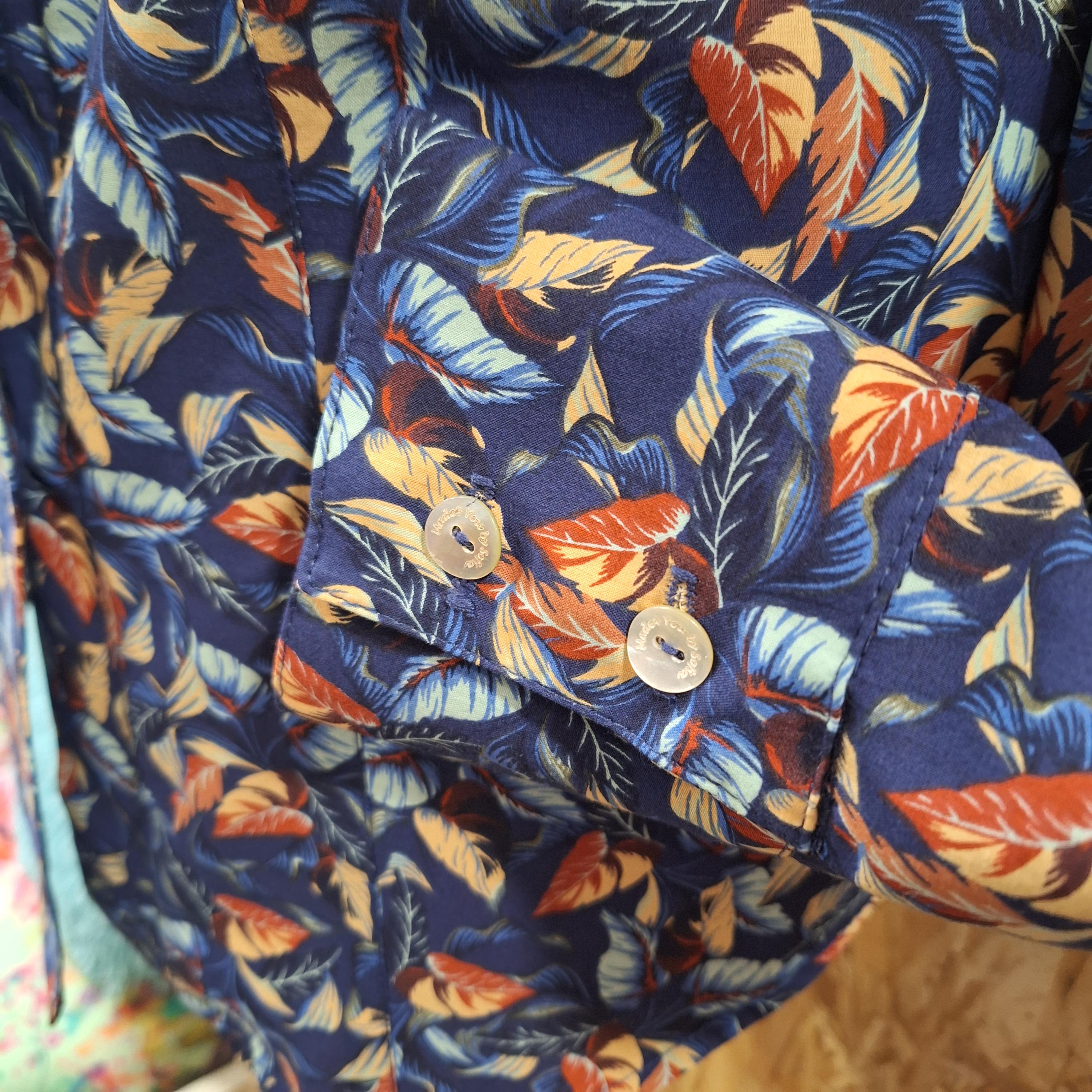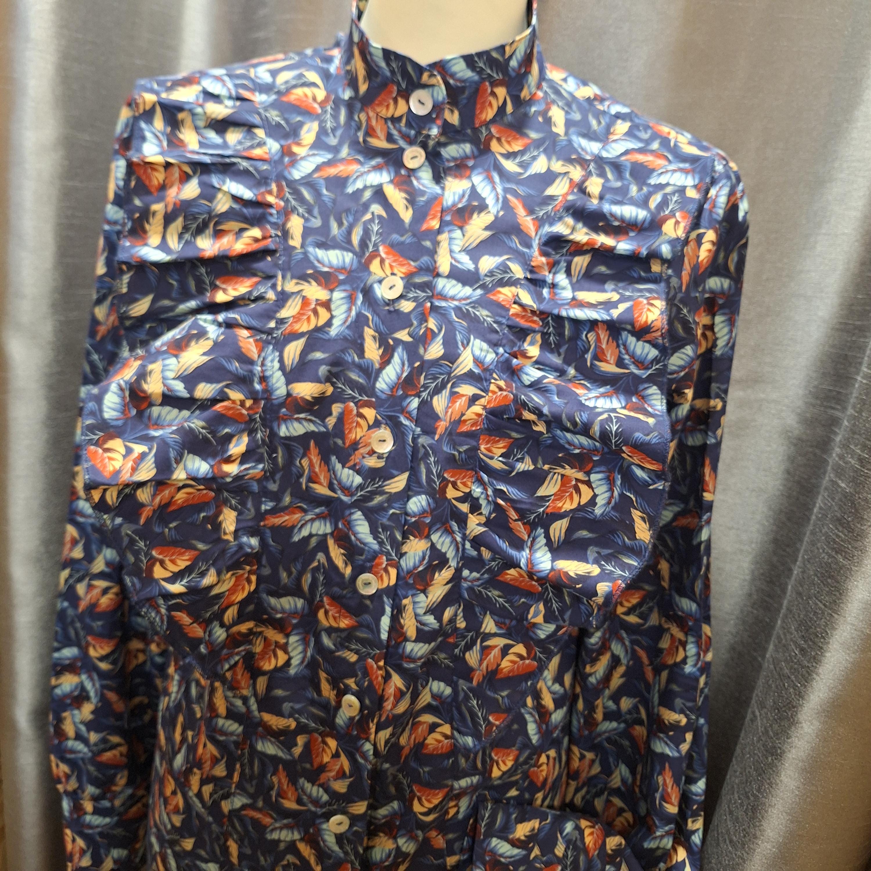 • Printed cotton shirt with a tropical leaf pattern and vibrant shades of blue, orange and brown. With a ruffle front and half collar.